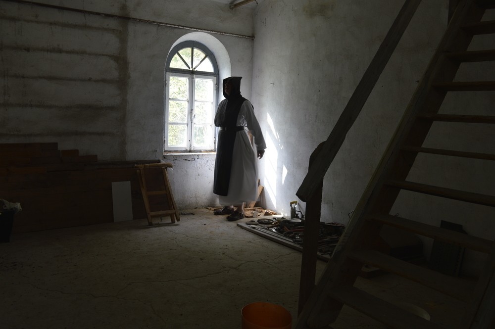 Dieses Foto zeigt einen bestimmten Ort, an dem die Bauern die Gärten und das Innere des Klosters pflegten. Hubert Barre hat dieses Bild von Cyprien aufgenommen, einem Mönch, der den Ort gut kennt. Er kommt regelmäßig an diesen geheimen Ort, um dieses Haus zu betrachten, anzubeten, aber auch um es zu beobachten: eine klösterliche Klausur, eine Umgebung des Gebets, die Gott und den Mönchen vorbehalten ist. Alles hat seine Bedeutung, das Licht auf dem Fenster, die Treppe, den Fensterrahmen, den Schatten des Mönchs im Licht des Lichts, den Boden, das Volumen des Raumes und schließlich die Rahmung, die die Objekte in Proportionen erscheinen lässt. Hubert Barre, Fotograf, hält es für wichtig, sich auf die Technik zu konzentrieren, die dem Bild etwas mehr Tiefe verleiht. Dieses Foto stellt einen der geheimen Orte des Klosters dar, der der Öffentlichkeit verboten ist. Dieser Ort hat Hubert berührt, weil er ganz nah an der Natur liegt, direkt neben Lavendelfeldern und Weinreben. Dieser Ort genießt eine fantastische Ruhe.