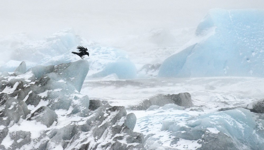 Die Lagune Jökulsárlón, Es gibt Lagunen in Island. Gefangen im Eis könnten sie ein weißes Paradies heraufbeschwören, wenn nicht die Anwesenheit eines kleinen Lebens, in diesem Fall eines Raben, der Szene ein wenig Rhythmus und Geheimnis verleihen würde, wie eine Art ernster Akzent. Man denkt an die Eisschollen im Debakel, die Caspard David Friedrich malte, und an Edgard Allan Poes Raven, so wahr ist es, dass dieses schwarze Tier das Bild, die Erinnerung an Tod und Angst hinter sich herschleppt.