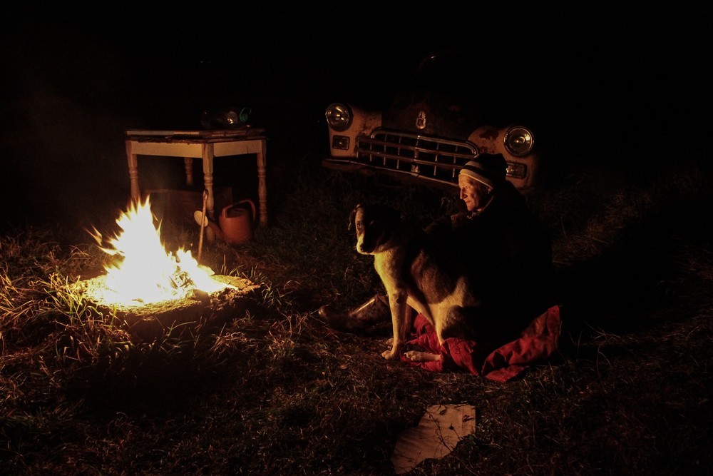 Das Bild hat eine doppelte Lesart: Marinas Gesicht blickt aus der Ferne auf das Feuer. Marinas Hund wird vom Fotografen Geogii Vinogradov monopolisiert. Im Hintergrund des Bildes erinnert der Kühlergrill eines schwach beleuchteten alten Autos beim zweiten Lesen an den Kontext des Museums einer anderen Zeit, dem der ehemaligen Sowjetunion.