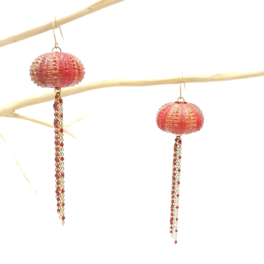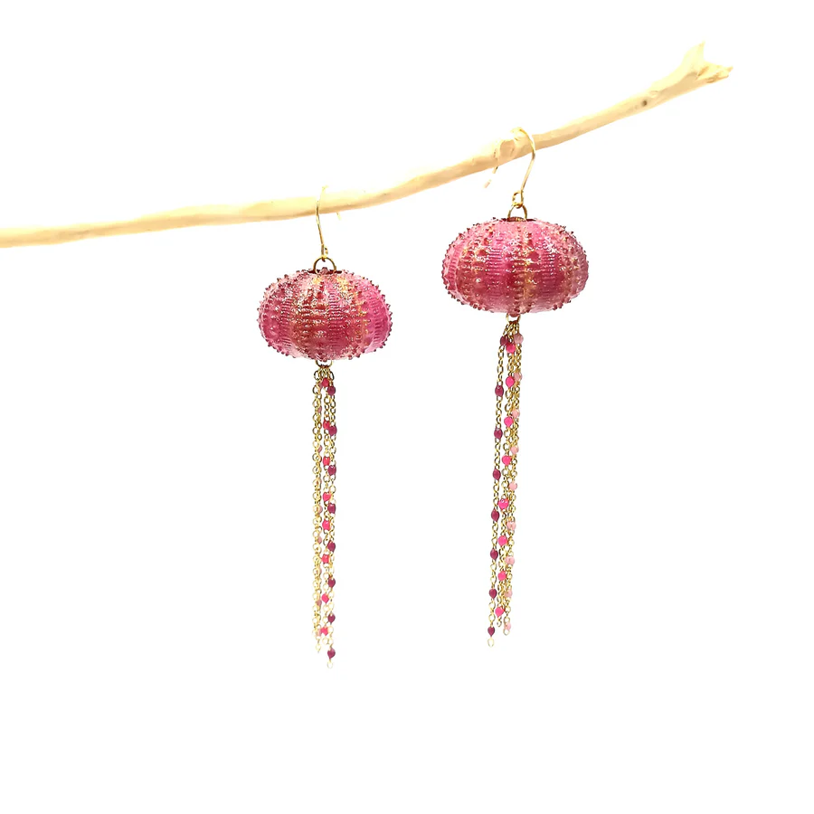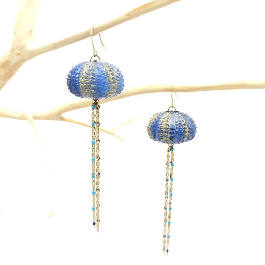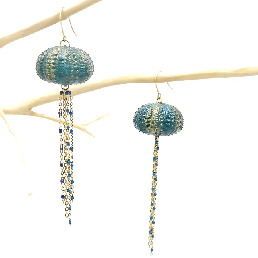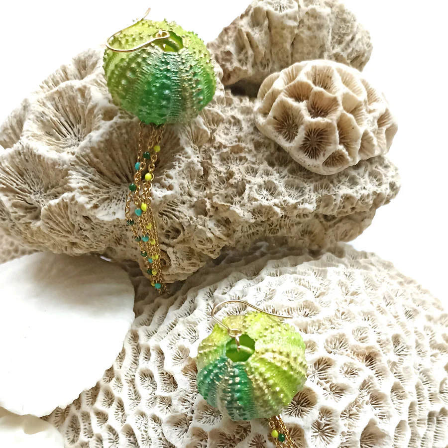 Diese baumelnden Ohrringe in Form eines Seeigels rufen die Zartheit der Meereswelt und die Poesie des Meeresbodens hervor. Ihr strukturiertes Design fängt das Licht ein und zieht subtil die Aufmerksamkeit auf sich.