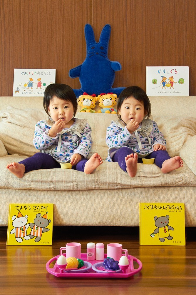 Sie sind zwei Jahre alt. Beide sind einige Kuschelige Kinder. Sie spielen nicht zu zweit und kämpfen oft um die Arme ihrer Mutter. Kaho, Die ältere Schwester ist etwas stur, während Shiho, die jüngere Schwester, eher sanftmütig ist und ihrer älteren Schwester nachgibt. Sie lieben es zu lesen Bücher, spielen auf der Teeparty und lieben die Kuscheltiere von „Hanachan“, der Schwester von „Shimajiro“. Sie fressen gerne und viel. Sie hörten nicht auf Kuchen naschen während des Fotoshootings.