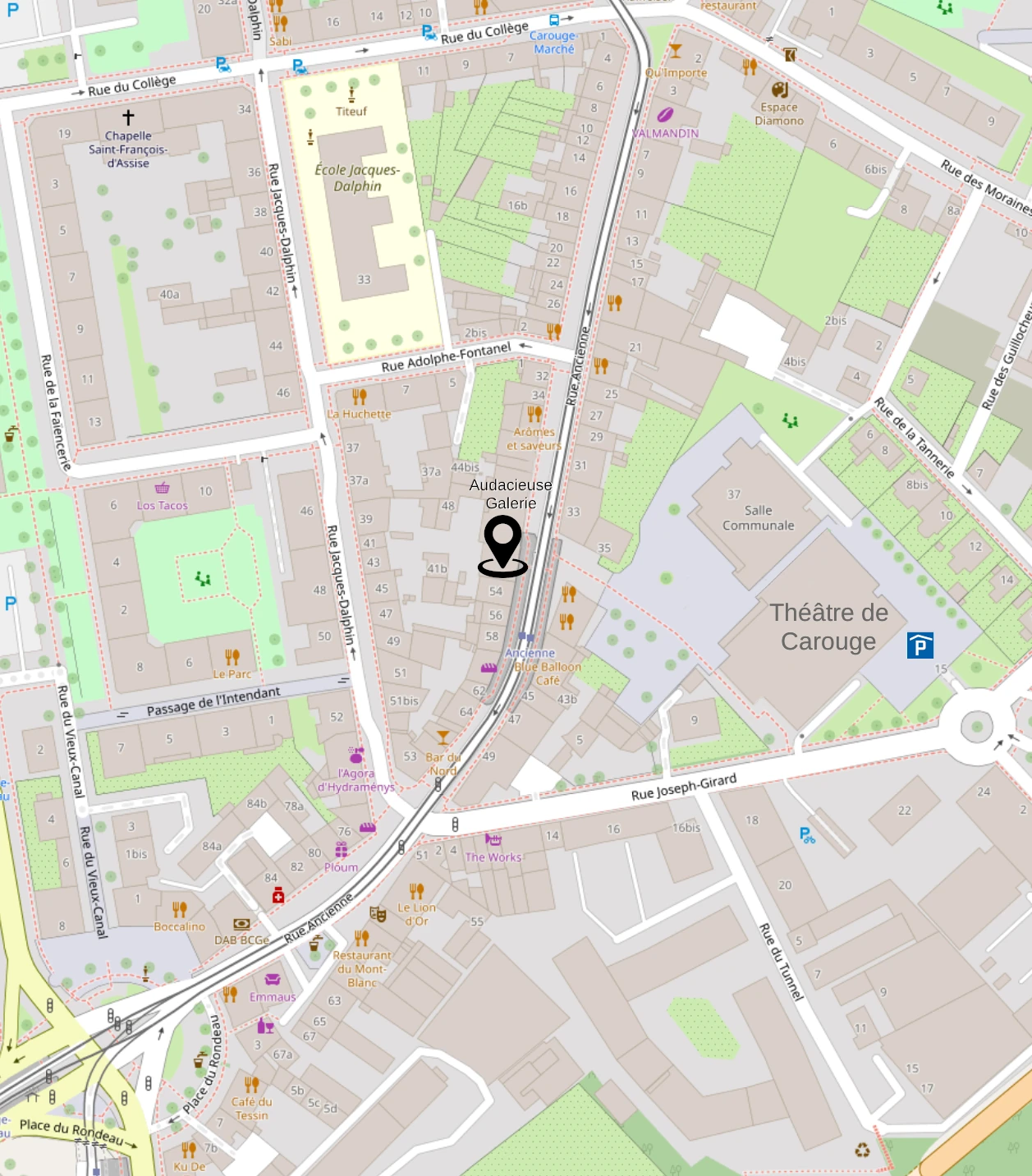 Park in the underground car park of the Carouge Communal Centre (Sous le Théâtre de Carouge). In 80m on foot, exit the car park towards the entrance of the theatre and then cross the Place du Théâtre, the shop will be located opposite you at number 50 rue Ancienne. Audacieuse-Galerie is also a team delighted to welcome you.
