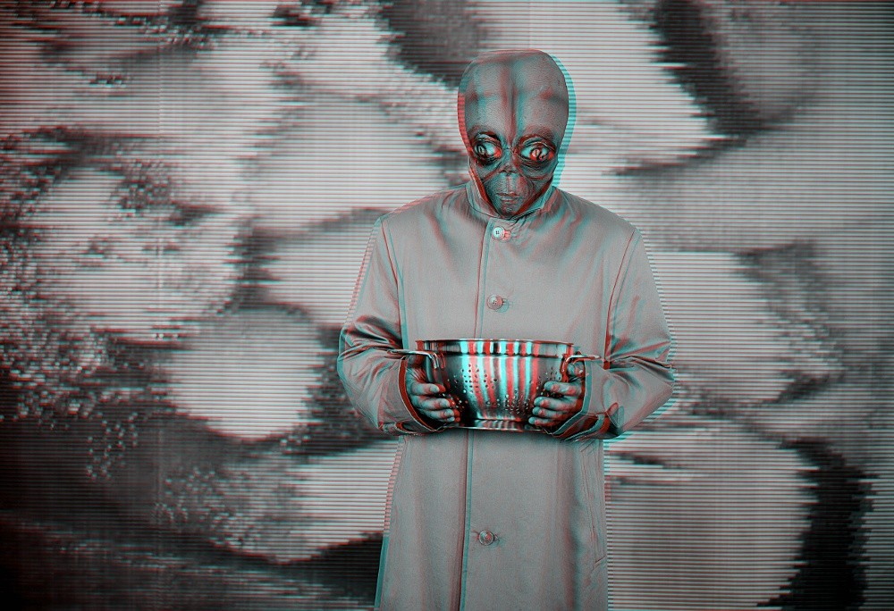 His oversized eyes ignore the screen in the background, invaded by an encrypted chaos of blurred pixels, while Canal+ stubbornly refuses to deliver its images. The sieve then becomes a sacrilegious tool, a pseudo-technological gadget integrated into an improvised ritual of deciphering. The alien, sieve in hand, takes on the appearance of a clumsy guru of interstellar zapping-culture. The scene, both ridiculous and fascinating, is based on a powerful game of discrepancy: this alien, capable of mastering interstellar travel, finds himself reduced to tinkering with a derisory household object in an attempt to access a locked media universe. The humour is born from this total absurdity, between ultra-technology confronted with the most basic D system, the almost religious fervour in the face of the television stream and the cosmic solitude of a spectator deprived of the consumption he covets. Photography thus imposes itself as a visual satire, offering a gentle and ironic critique of media addiction while celebrating inventiveness and imagination as answers to contemporary digital frustrations.