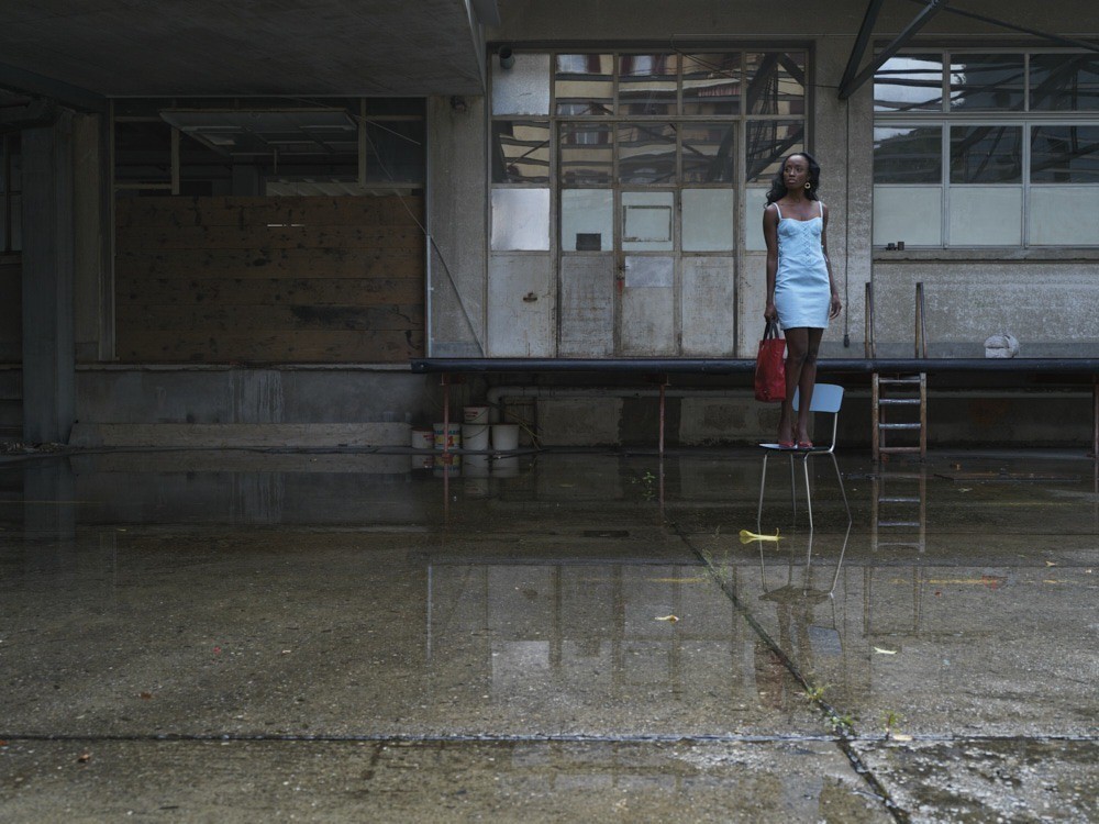 In the courtyard of this factory, an abandoned kitchen chair. By chance, just color that goes with that Versace dress found in the attic, by chance, only color that goes with Racquel’s Jamaican complexion.