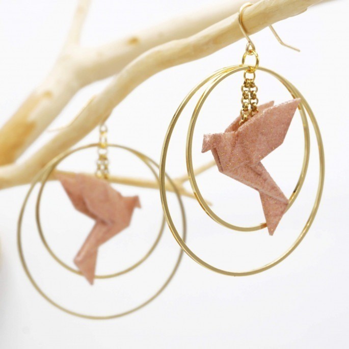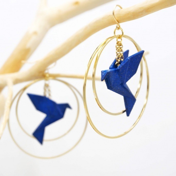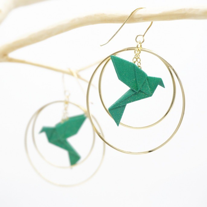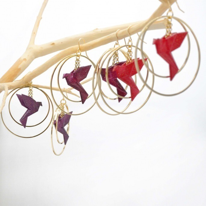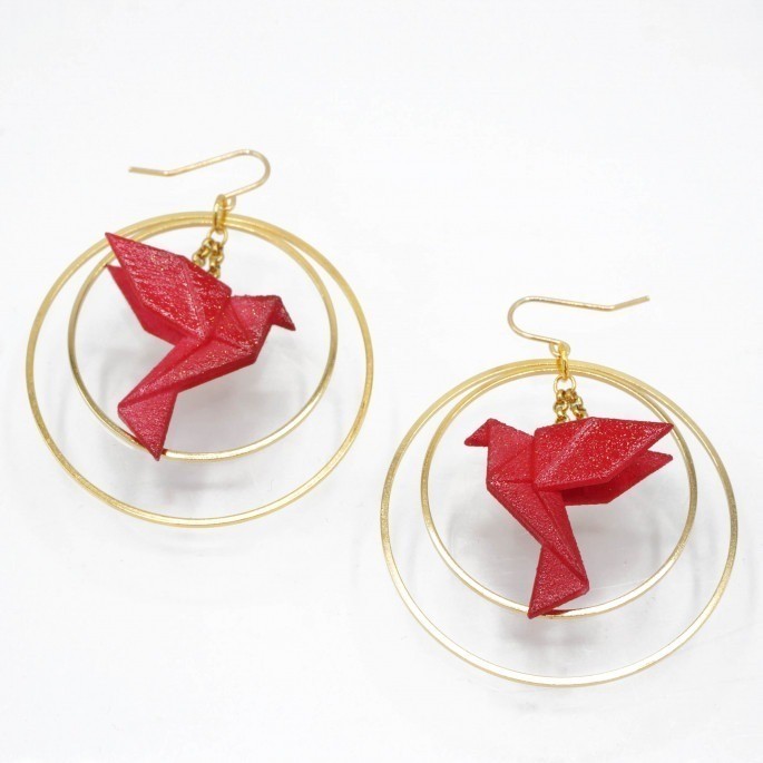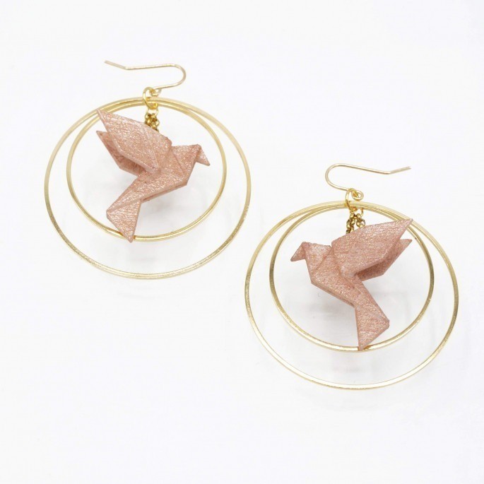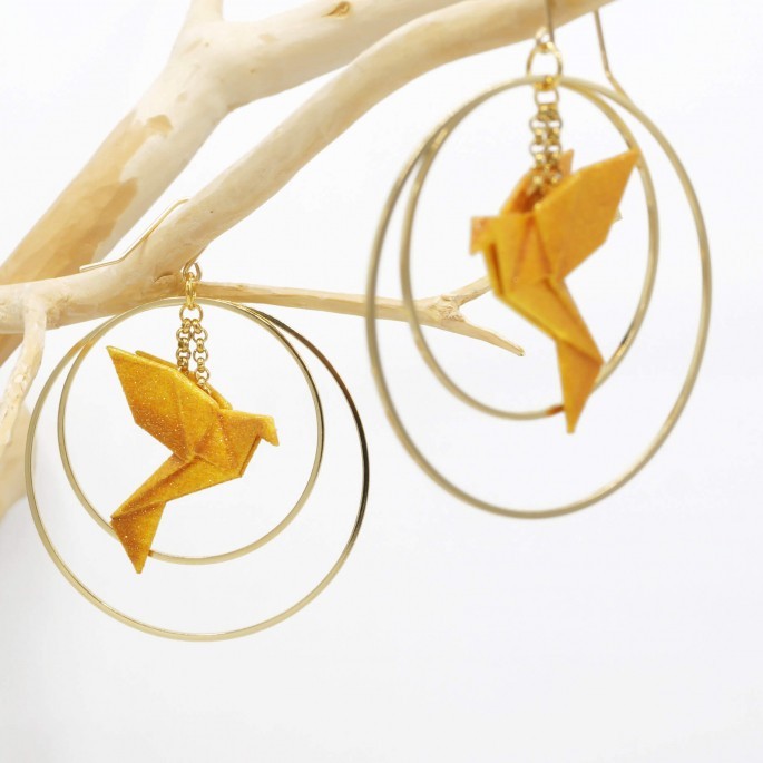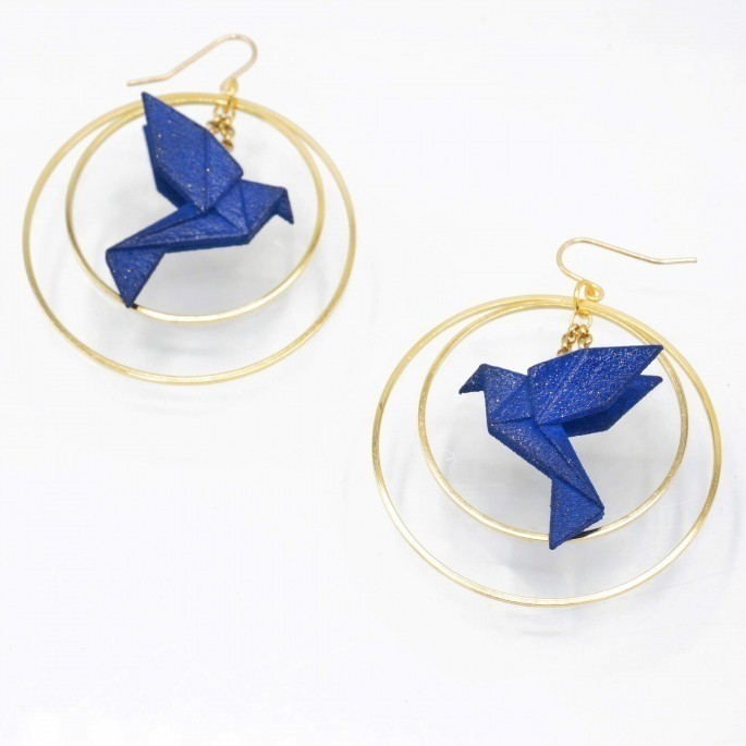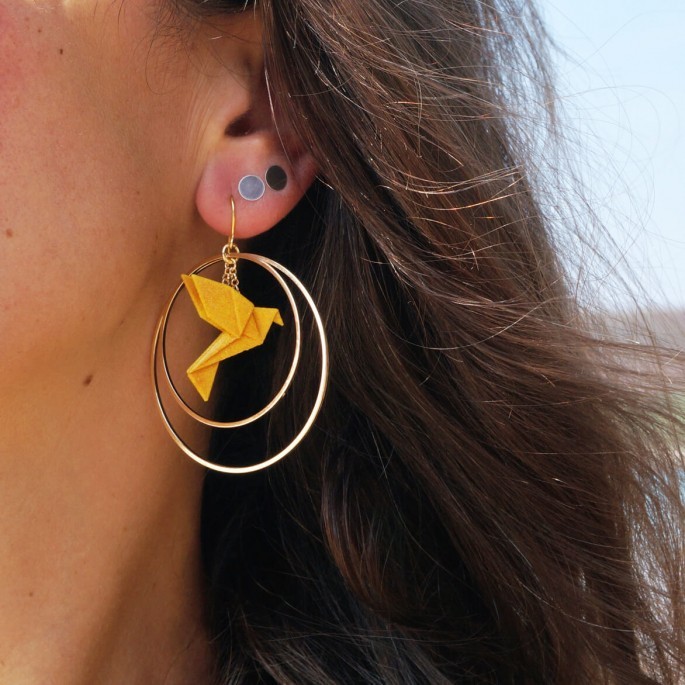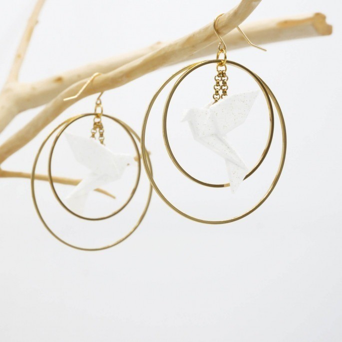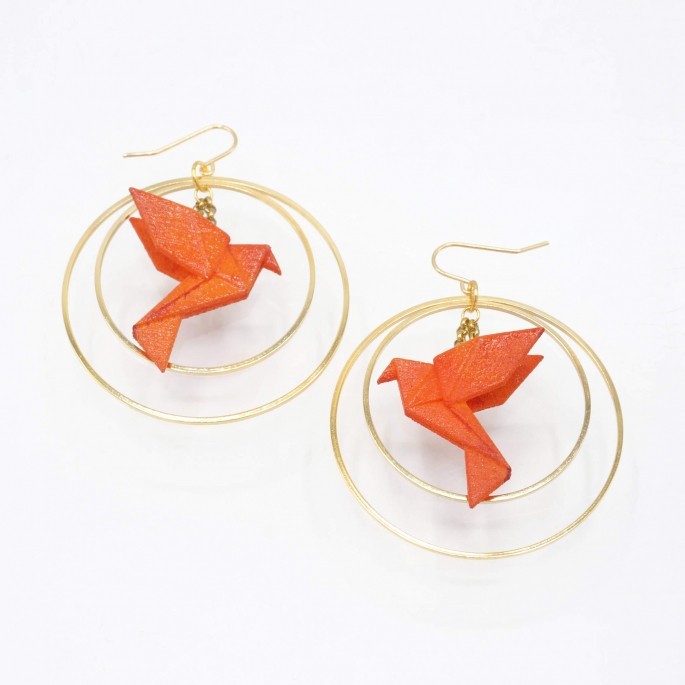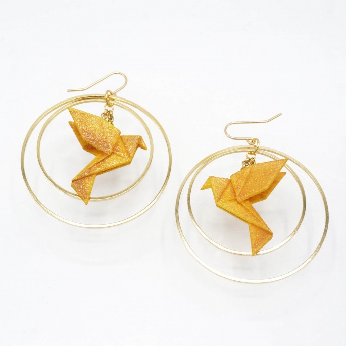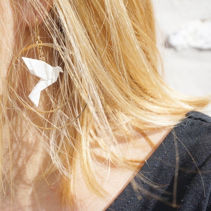 Poetic earrings whose shape is inspired by the art of origami. The folding of the paper bird is taken from a 3D print, which is then assembled and painted by hand. Two golden rings surround the bird. Dimension: small ring 35 mm; Large Ring 45 mm Material: gold-plated brass and gold-plated 925 silver, fused nylon bird.