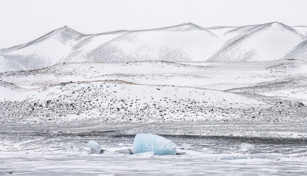 The glaciers carry and push before them the enormous mass of moraines, black rocks under the threadbare mantle, more or less, of the sleet, of the snow brushed by the blizzard. The horizon is then drawn in negative, charcoal lines or Indian ink washes. Curves and nipples give the landscape a more secret sensuality.