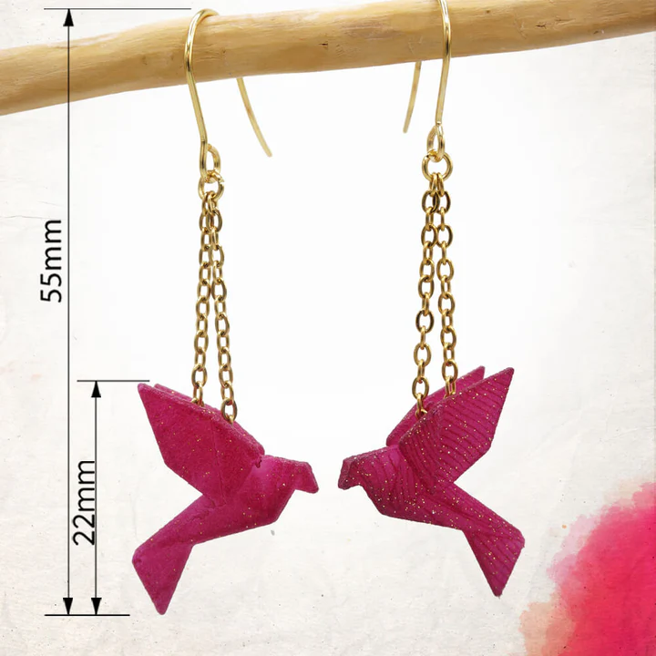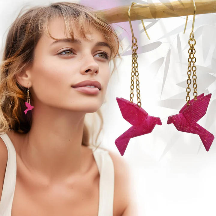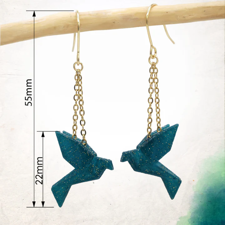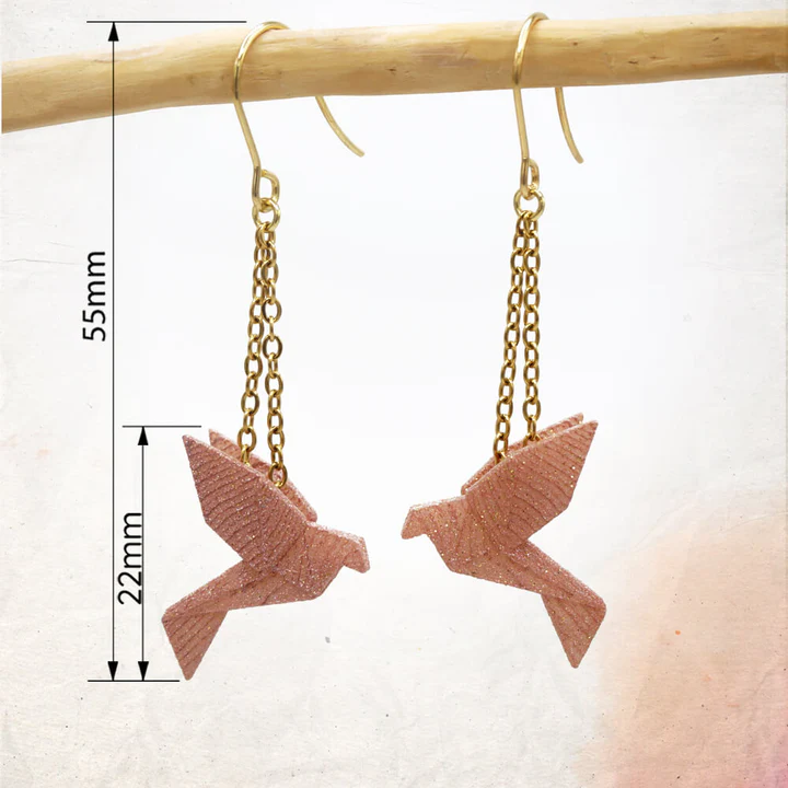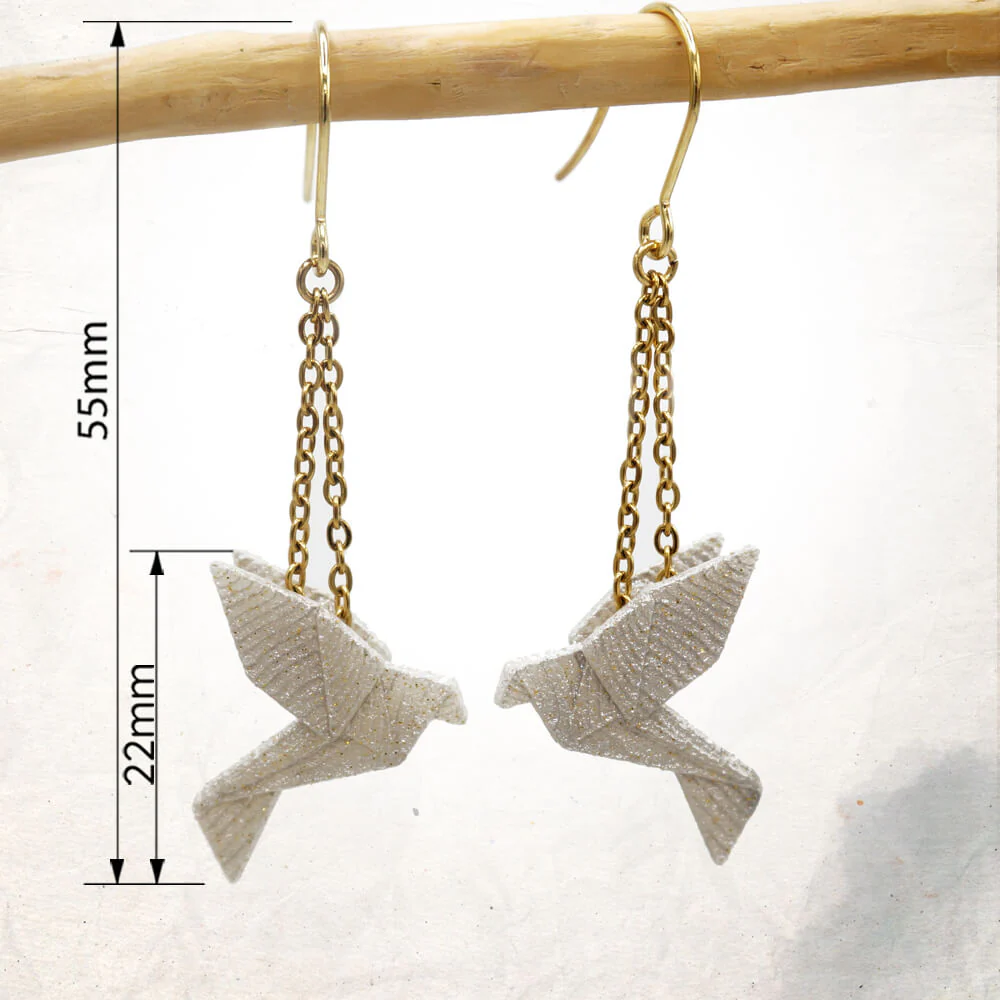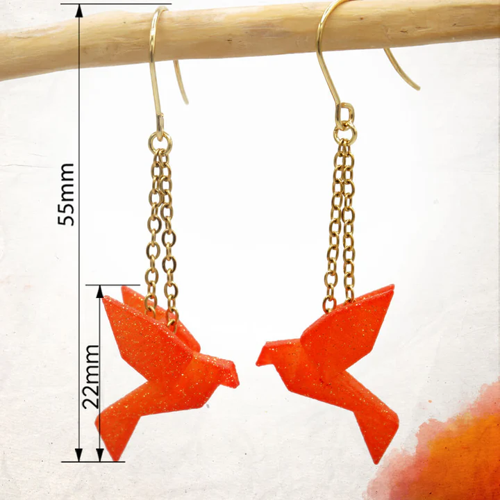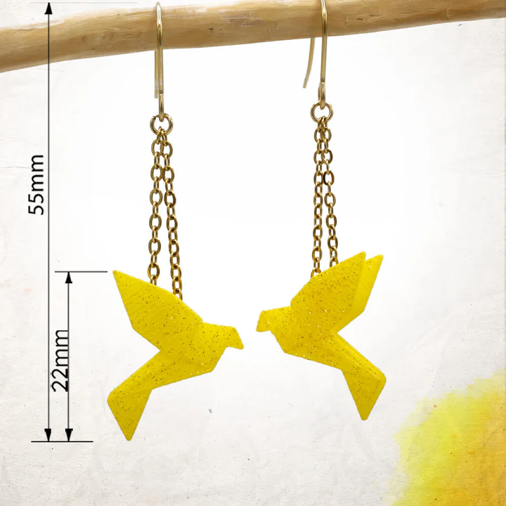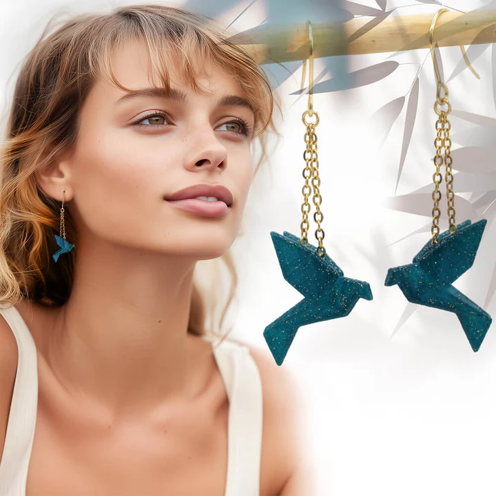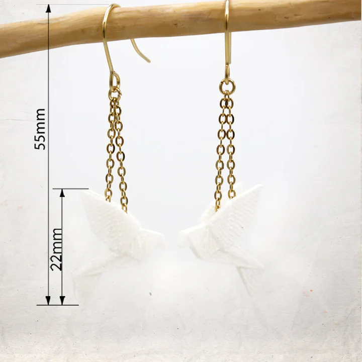 Légères et élégantes, ces boucles d’oreilles sont inspirées par l’art ancestral de l’origami. Chaque oiseau est conçu avec précision en impression 3D moderne, puis peint à la main. La suspension de l’oiseau sur une chaînette argentée, associée à un crochet en acier doré à l’or fin, apporte une touche de raffinement et de durabilité à l’ensemble.