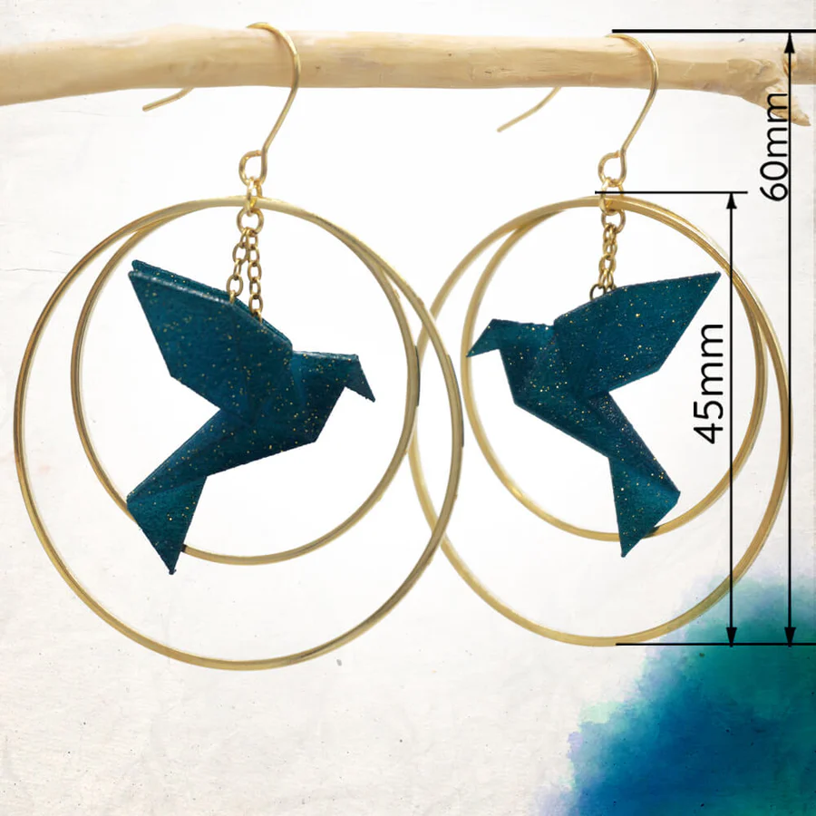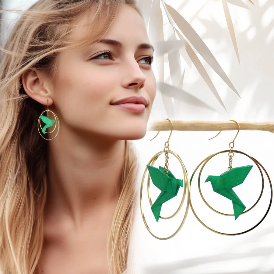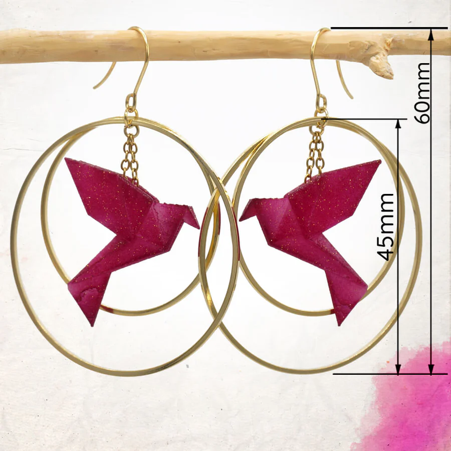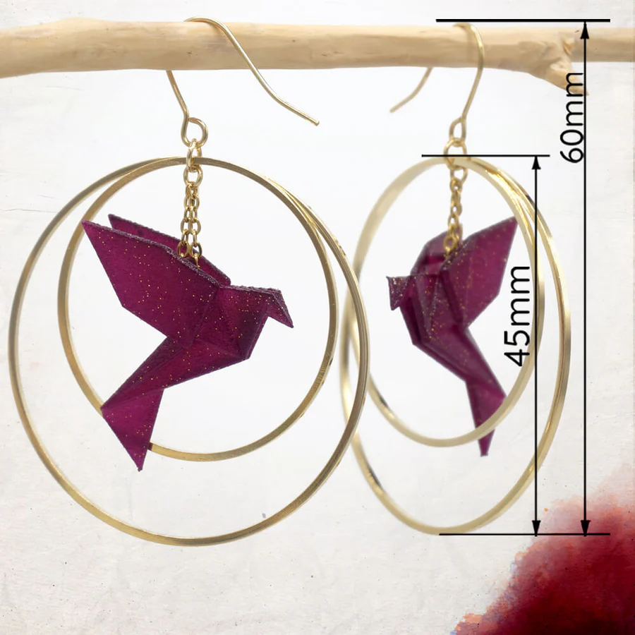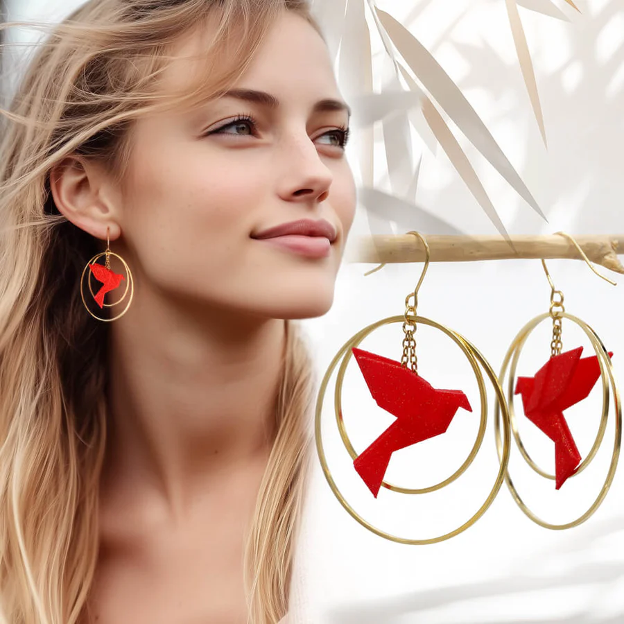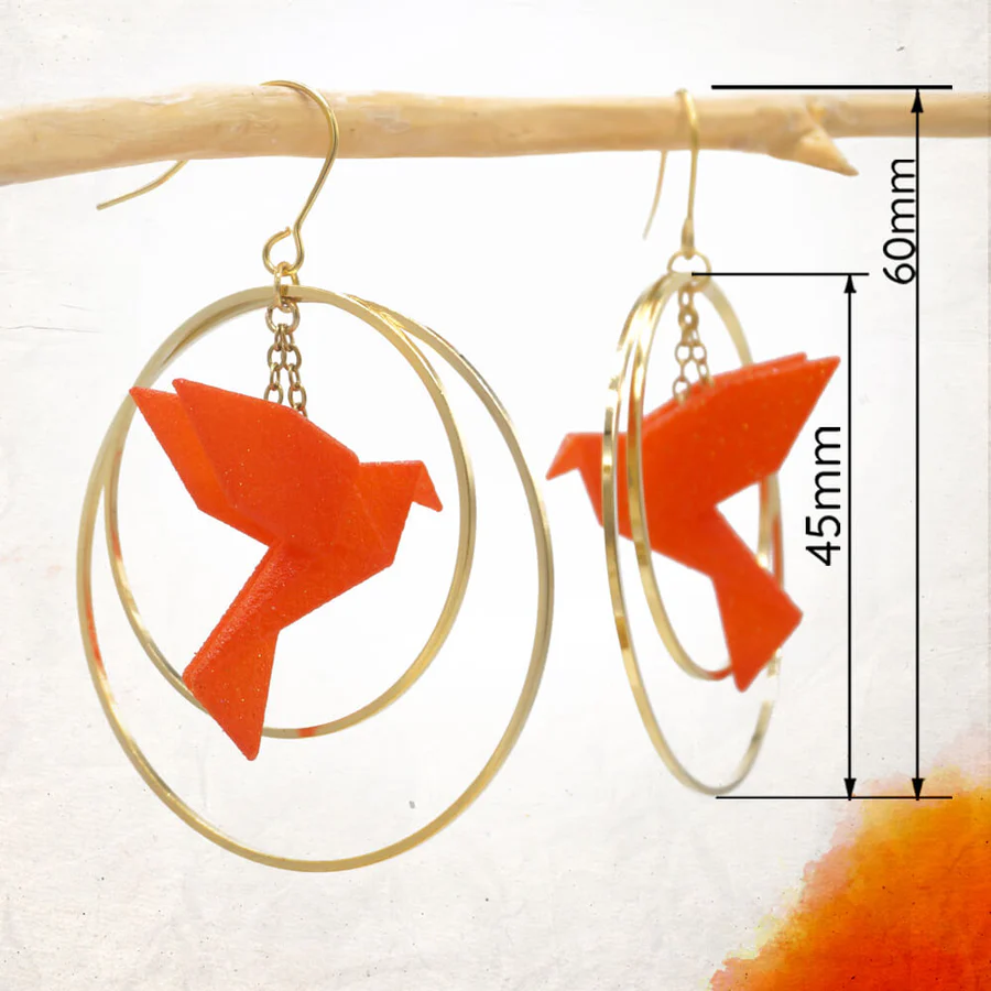 Boucles d’oreilles poétiques dont la forme est inspirée de l’art de l’origami. Le pliage de l’oiseau en papier est tiré d’une impression 3D, qui est ensuite assemblé et peint à la main. Deux anneaux dorées entourent l’oiseau. Dimension : petit anneau 35 mm; grand anneau 45 mm Matière : laiton doré à l’or fin et argent 925 doré à l’or fin, oiseau en nylon fusionné.