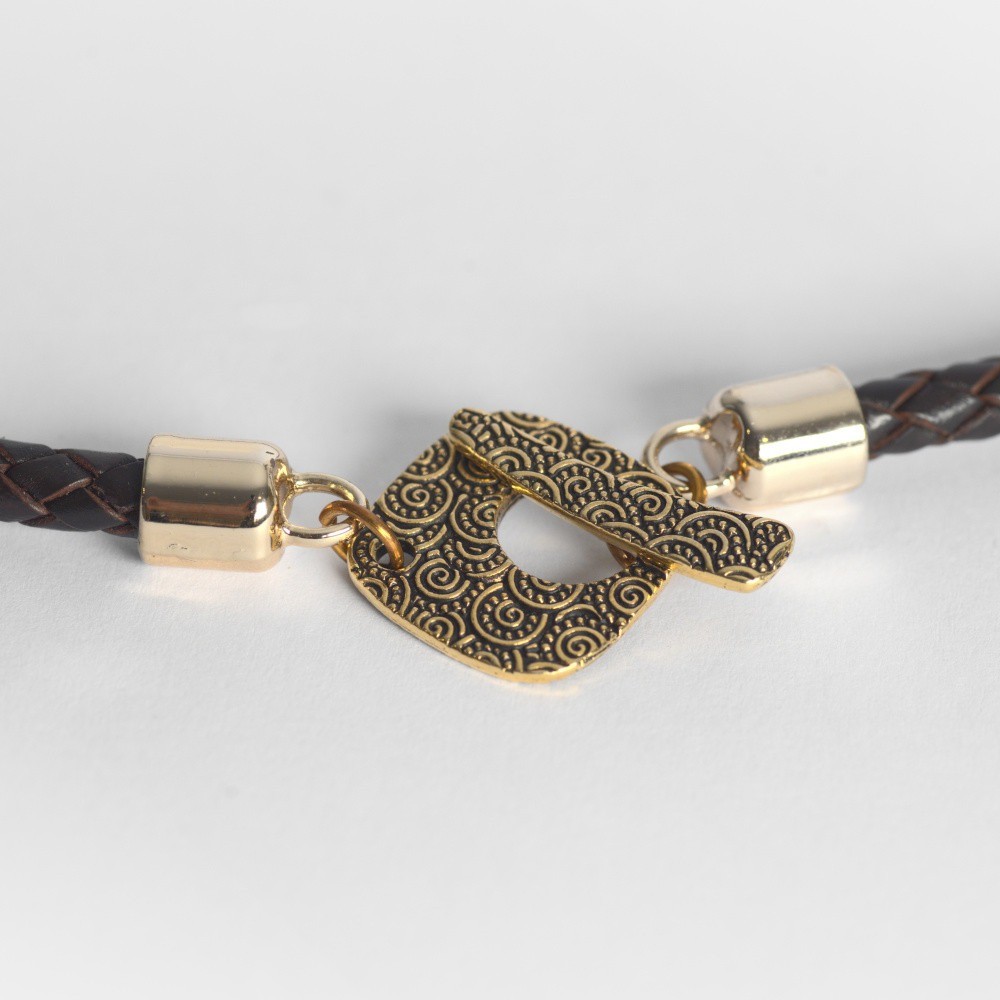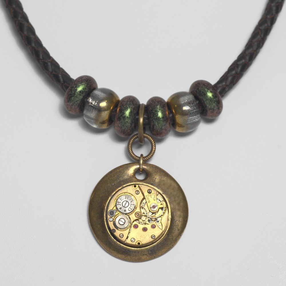 Le mouvement de montre transformé en pendentif est joliment encadré de perles de Murano, montées sur un collier de cuir tressé.