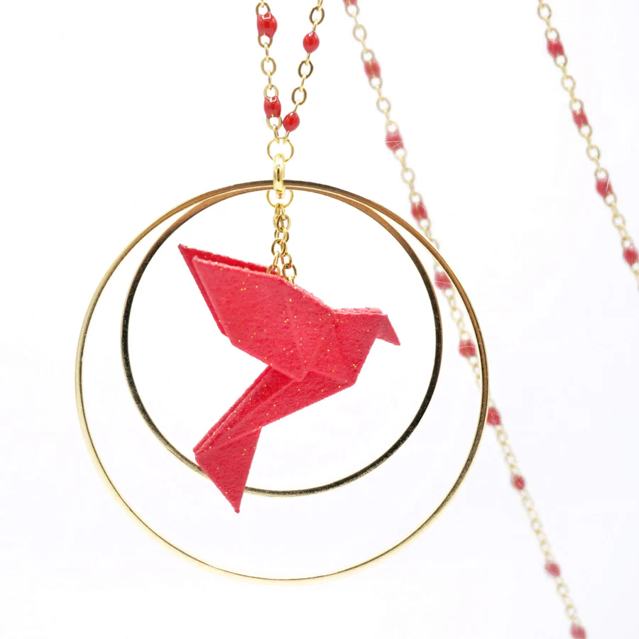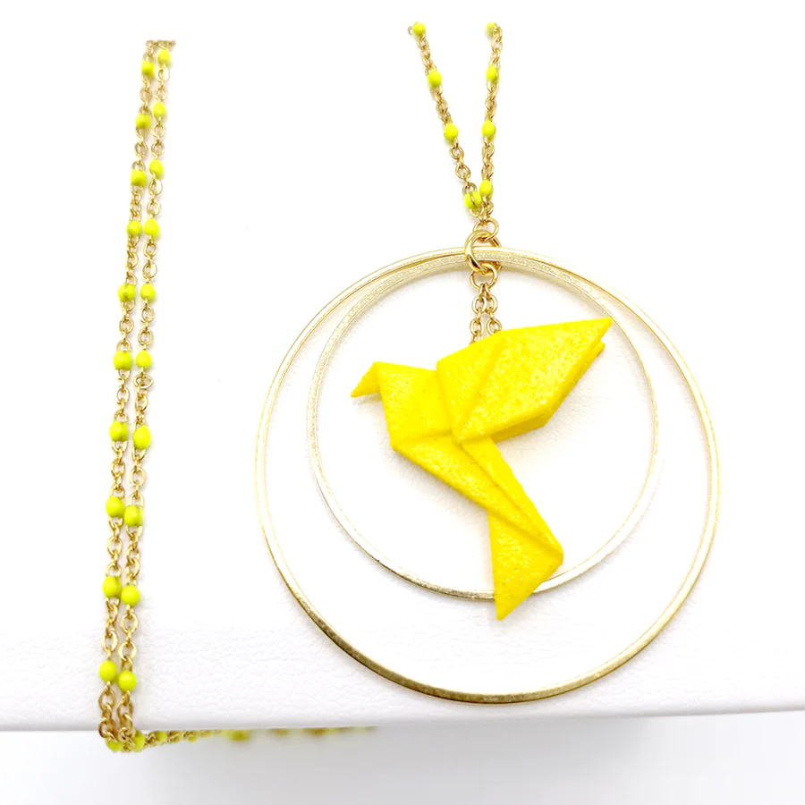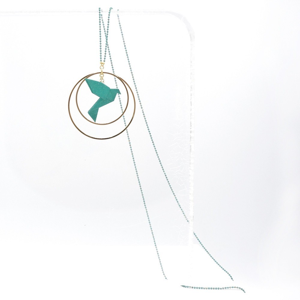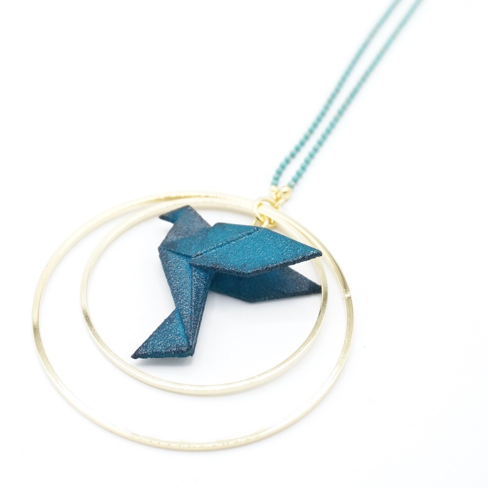 Matières : oiseau : poudre de nylon bio sourcée, chaîne en argent 925 teintée, longueur 80 cm