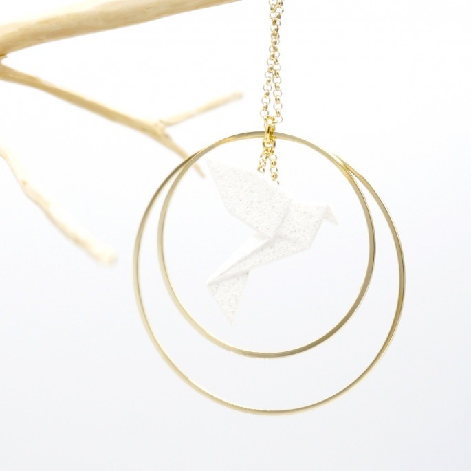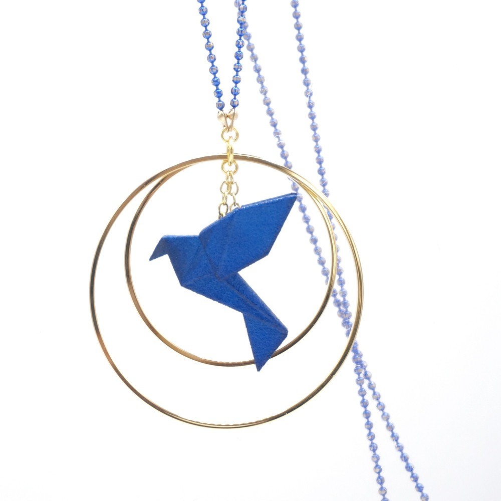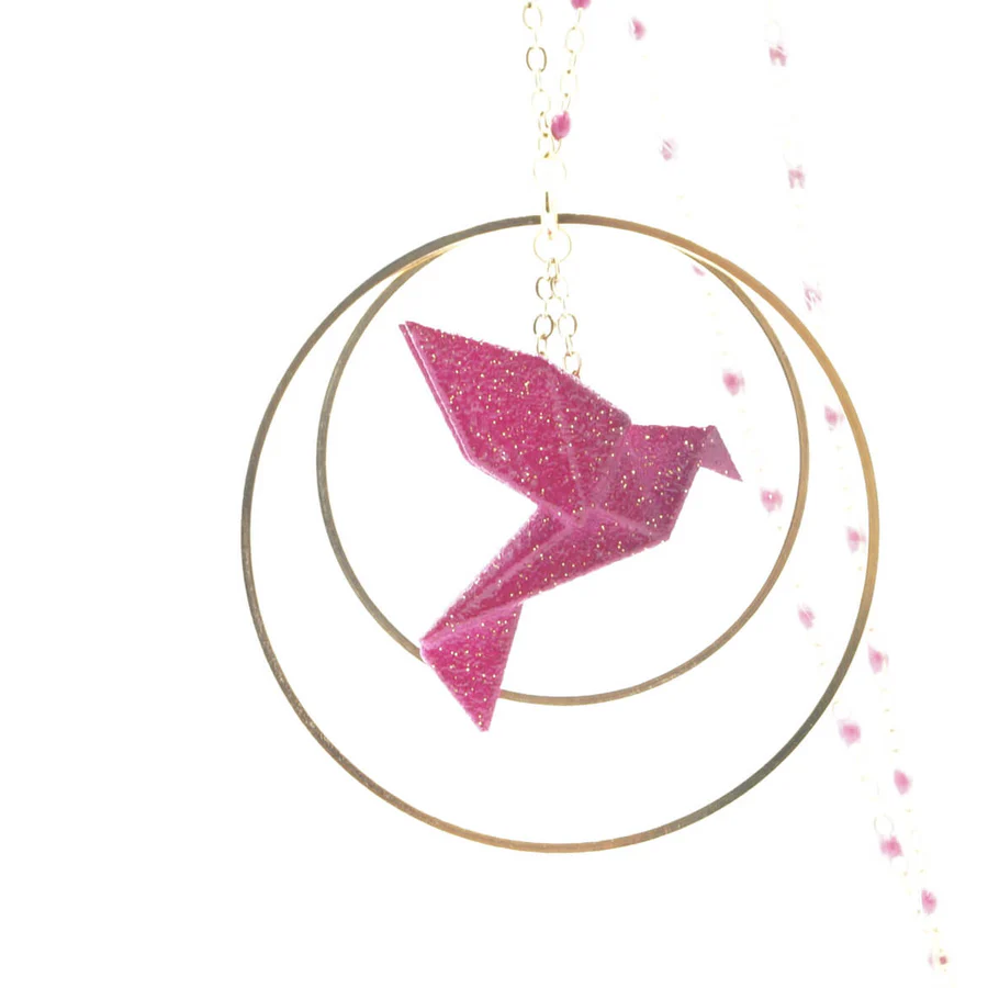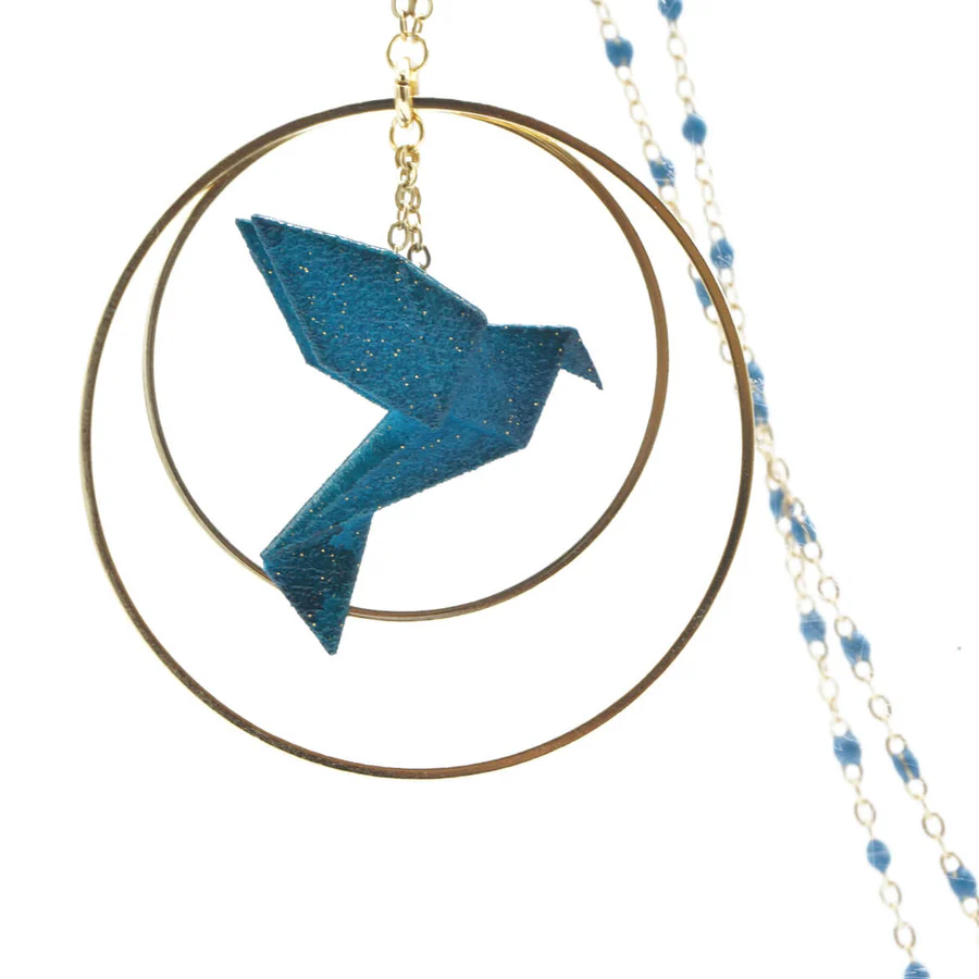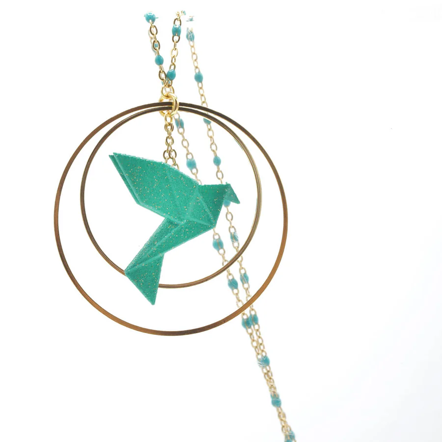 Matières : oiseau : poudre de nylon bio sourcée, chaîne en argent 925 teintée, longueur 80 cm