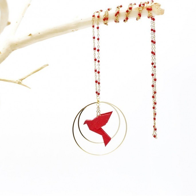 Dimension : hauteur de la chaîne et de l’anneau 45 cm, oiseau 26 mm, anneaux 5 et 4 cm