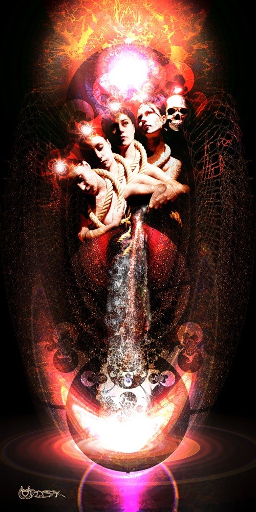 Précipitées dans le Tartare après leur jugement, les 50 sœurs pour expier leurs meurtres, furent condamnées à devoir remplir pour l’éternité une jarre sans fond. A l’instar de la faute originelle, elles payent pour l’éternité l’erreur commise. Au delà de la tragédie grecque dont elles sont issues, c’est l’aspect philosophique et universelle du sceau Envie/Desir qui se joue, où l’envie procède du vide, tandis que le désir procède du plein ! L’un est effondrement tandis que l’autre est jaillissement. Traité ici sur le mode stellaire d’un jaillissement solaire aussitôt englouti dans la béance d’un trou noir ! A leur insu elles rejouent en chacune d’elle la trilogie des Parques Tisserandes du fil de la vie humaine, rompu à sa fin par la lame implacable d’Atropos et récupéré par Clotos pour créer un nouveau brin ! Le cycle de nouveau généré, l’Ouroboros astral comme solution à la dualité Ying/Yang.
