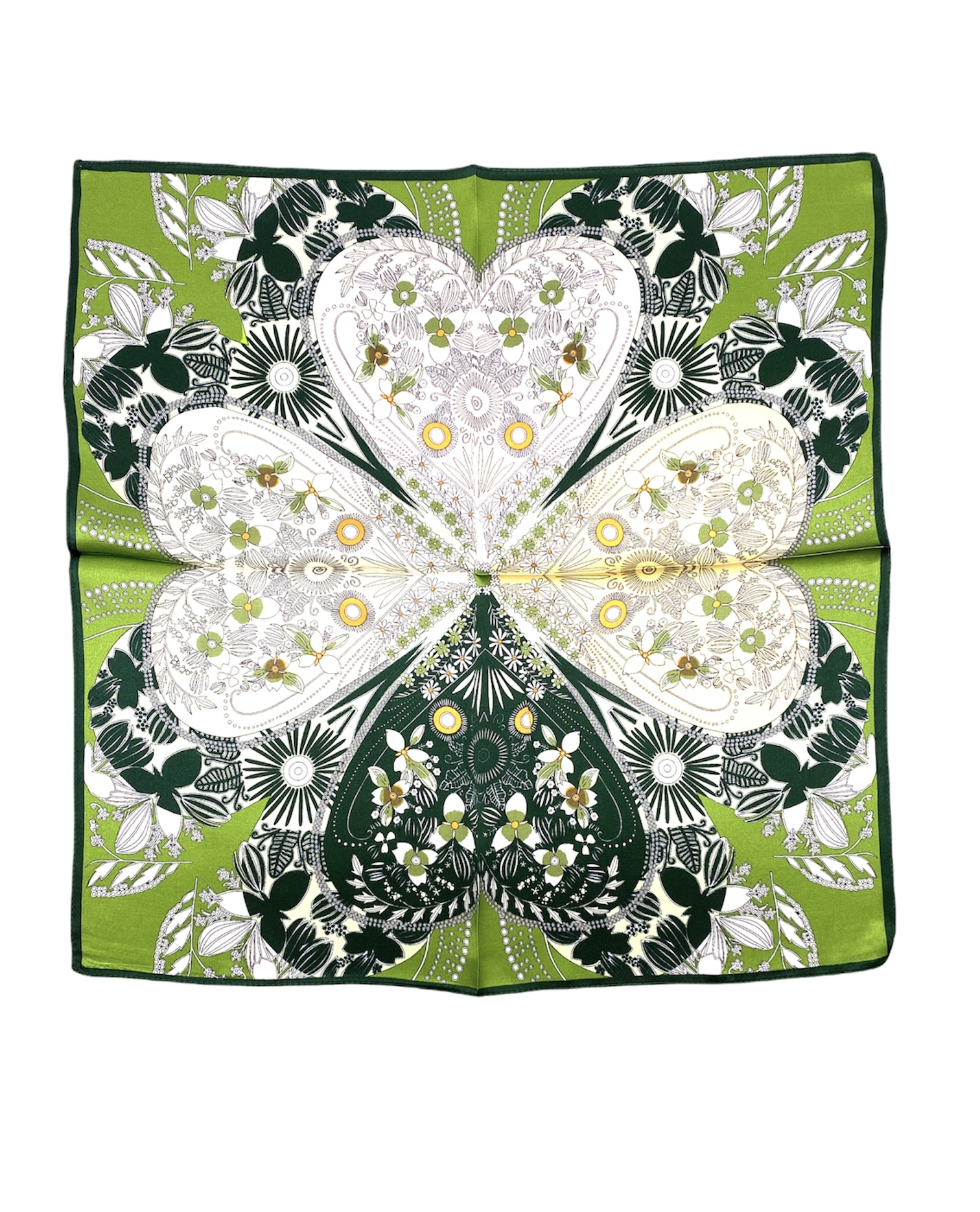 Foulard carré de soie vert motif floral coeur en trèfle cœur
