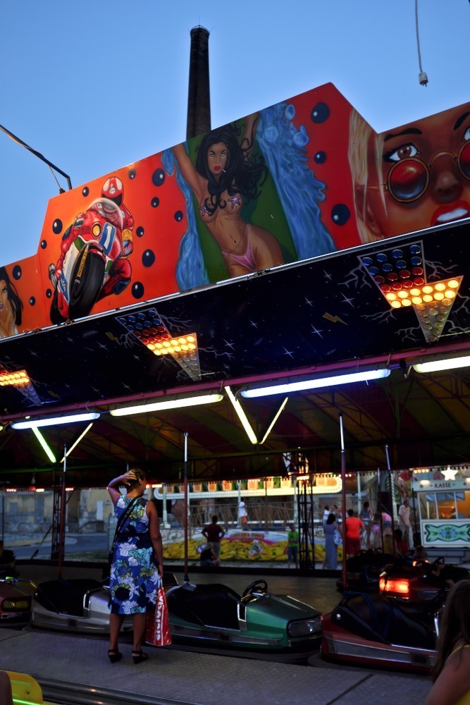 LUNA PARK s’est réveillée, ses couleurs et ses lumières m’attirent comme un papillon qui virevolte dans la nuit. Je m’arrête devant ce manège avec ses lumières électriques et ses dessins de pin up à moto. Mon oeil s’arrête sur cette prise débranchée qui tombe du ciel. Les autos tamponneuses bien rangées attendent patiemment les passagers. Une femme de dos, se passant la main dans les cheveux, semble hésiter à embarquer, Sur le fil, je fige ce mouvement pour l’éternité.