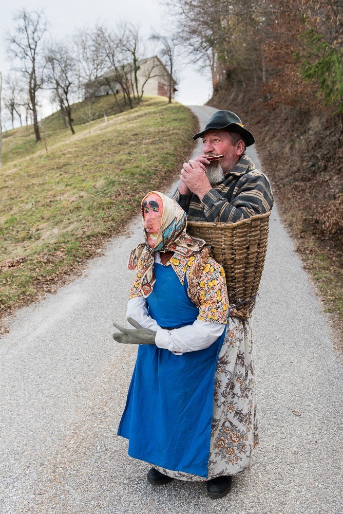 Cette baba (vieille dame), qui fait partie du groupe traditionnel oraci, “porte” le joueur d’harmonica dans le défilé de Carnaval d’Okiç, un village de la région de Ptuj de Slovénie.