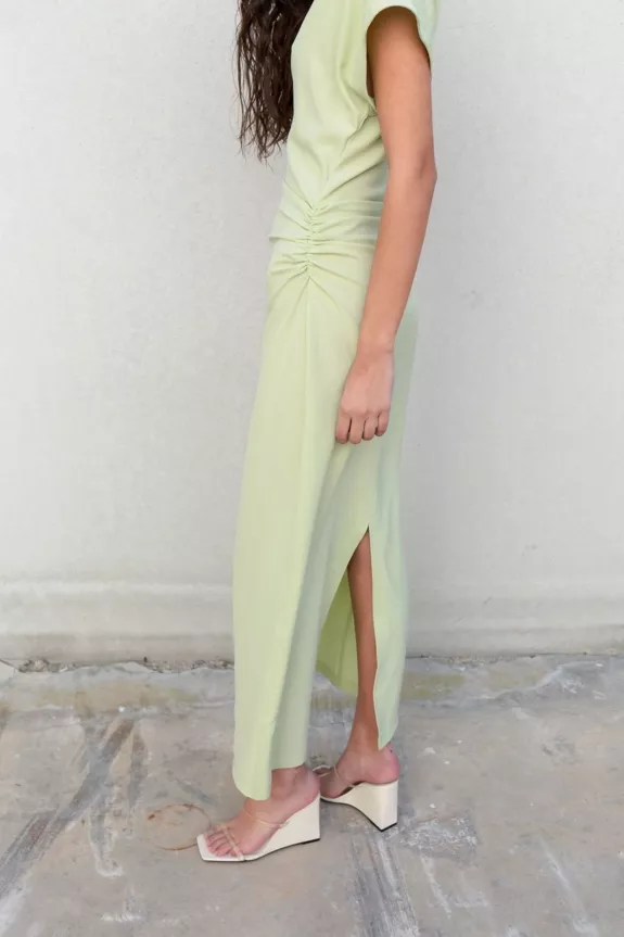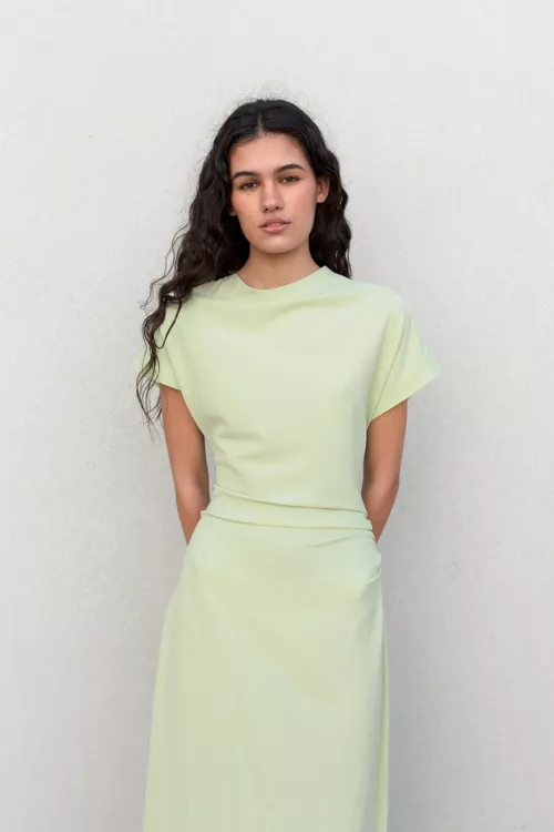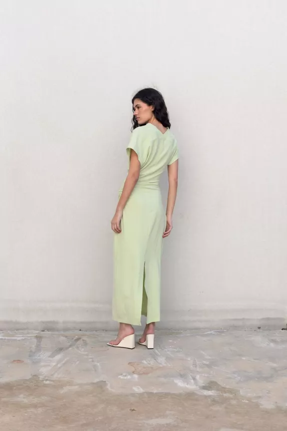 Cette robe longue drapée menthe pastel incarne une élégance moderne et lumineuse. Son tissu léger apporte fluidité et confort tout au long de la journée ou de la soirée. Le drapé latéral crée du relief et souligne naturellement la silhouette.