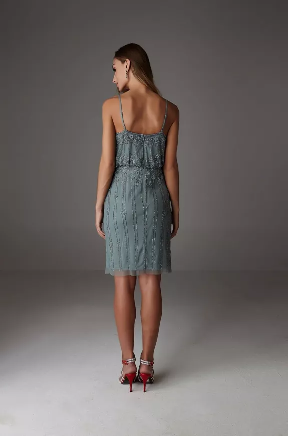 La robe est une véritable œuvre d’art textile, confectionnée dans un tulle rebrodé de perles et de sequins. Des feuilles élégantes s’entrelacent avec des lignes verticales subtiles, créant un motif organique et graphique à la fois.