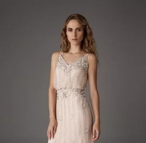 Le mariage de ces matériaux – le tulle brodé, les perles et sequins, et la doublure stretch – crée une harmonie parfaite entre esthétique et confort. Chaque détail, chaque texture se répond, apportant à la robe un caractère unique et une finition d’une grande finesse, pour un résultat à la fois élégant, sophistiqué et plein de mouvement.